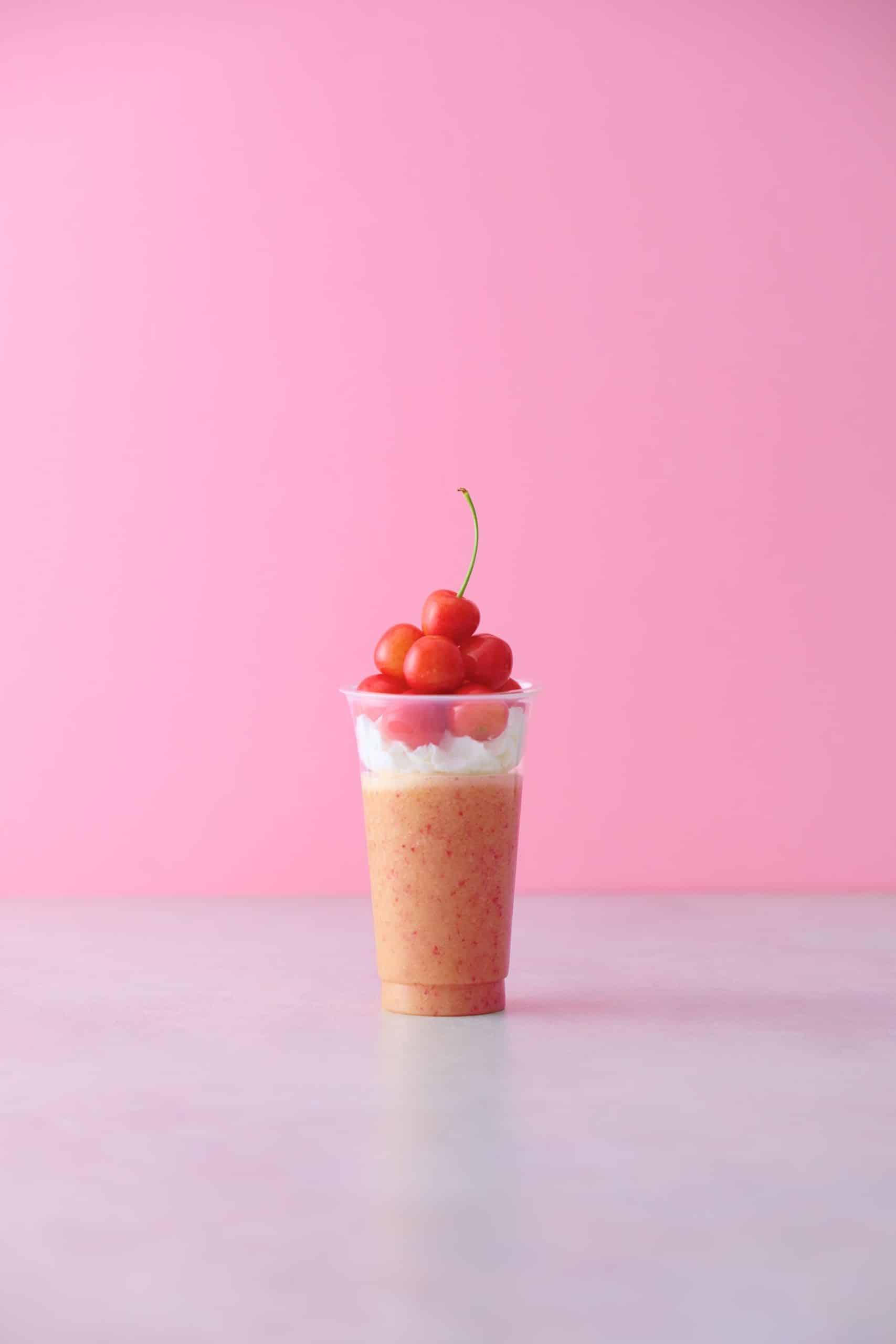 一つ一つ丁寧に種を取り除いた生のさくらんぼの果肉を使用し、注文を受 けてからその場でミキシングするこだわりのフレッシュジュース。1 杯あたり12〜14粒程度と、たっぷりのさくらんぼを使用した贅沢なドリンク。