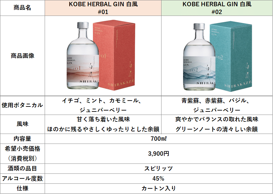 2種類のジンの風味は、時間帯によって表情をかえる“神戸に吹く風”をイメージしています。神戸産のイチゴとミント、カモミールを使用した「KOBE HERBAL GIN 白風 #01」は、黄昏時の神戸の山々に吹く風を思わせる、甘く落ち着いた風味で、ほのかに残るやさしくゆったりとした余韻が特長です。「同 #02」は神戸産のバジルと青紫蘇、赤紫蘇を使用し、朝日が差し込む神戸の山々に吹く風を思わせる、爽やかでバランスの取れた風味で、グリーンノートの清々しい余韻が感じられます。