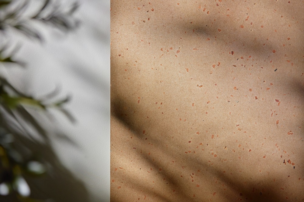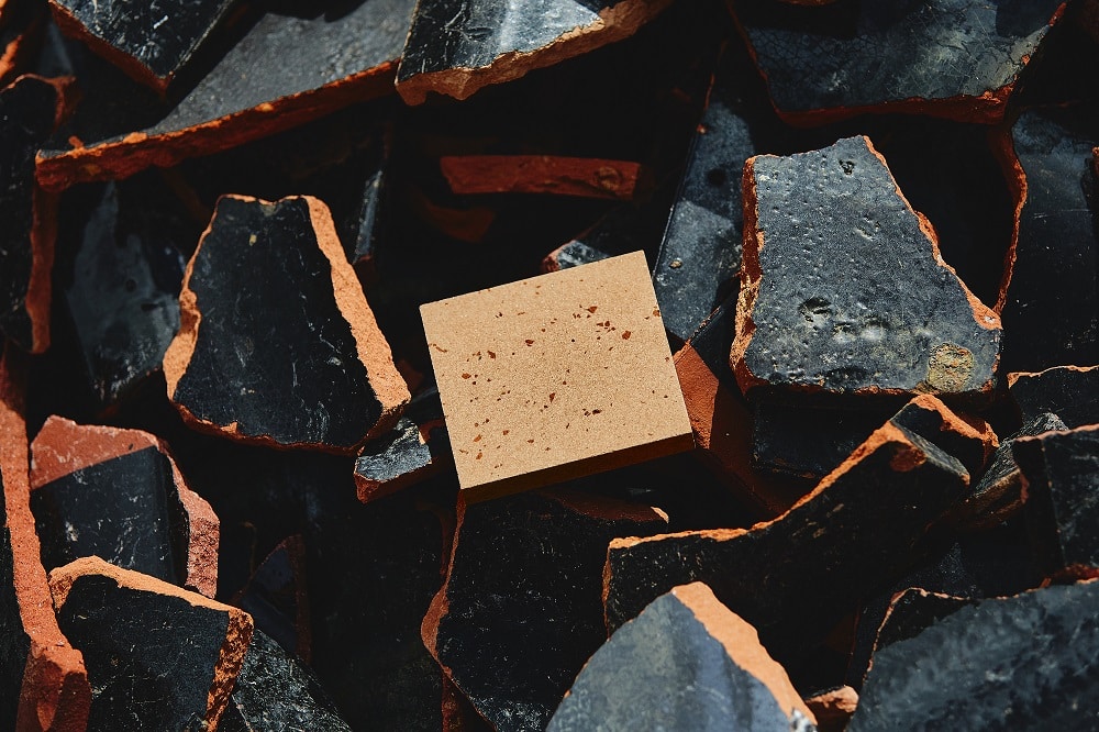 黒瓦を破片に粉砕したものを、自然由来の素材を意匠として活用したLIXIL独自の意匠建材「textone」の原材料に使用し、能登瓦仕様として開発。この素材は、黒瓦の表面の黒くて強いイメージとは異なる、素材そのもののオレンジ色を生かした、とても柔らかくて優しい色味が特長。ある程度の粒感が残るtextone独自の技術だからこそ、能登の黒瓦の風景が目に見える形で生かすことができます。