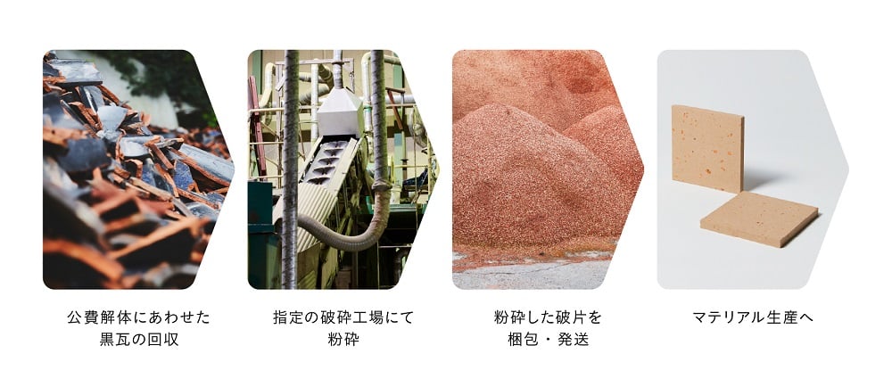 具体的には、公費解体時に回収された黒瓦を指定業者の粉砕を経てCACLが購入・保管し、有価物へと転換。その有価物を、LIXILの技術によって黒瓦の風合いが残る形で建材を製造します。その後、永山祐子建築設計により、この建材が建築物やインテリアなど、さまざまな形でアウトプットされることを目指します。