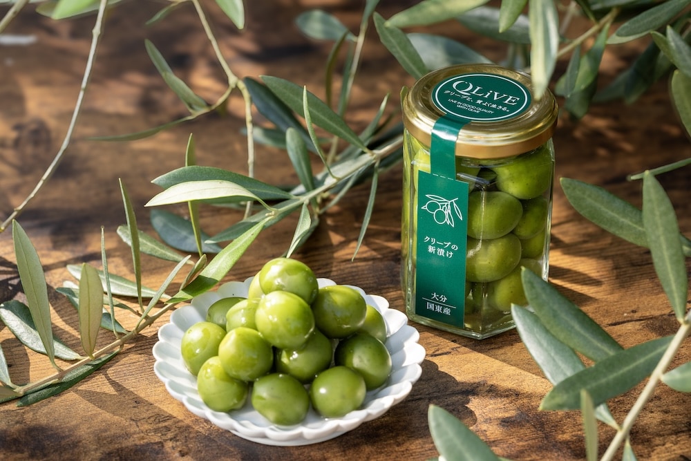 新漬けオリーブは、そんな国東で手間ひまかけて大切に育てられたオリーブ果実を手摘みで収穫した後、渋抜きしてから塩水に一週間ほど漬け込んだもの。口にするとさっぱりフレッシュな香りと、オイリーでジューシーな風味が広がります。独特の歯ごたえも新鮮な国産オリーブ果実ならでは。海外産にオイル漬けや酢漬けなどの加工品はありますが、まったくの別物です。