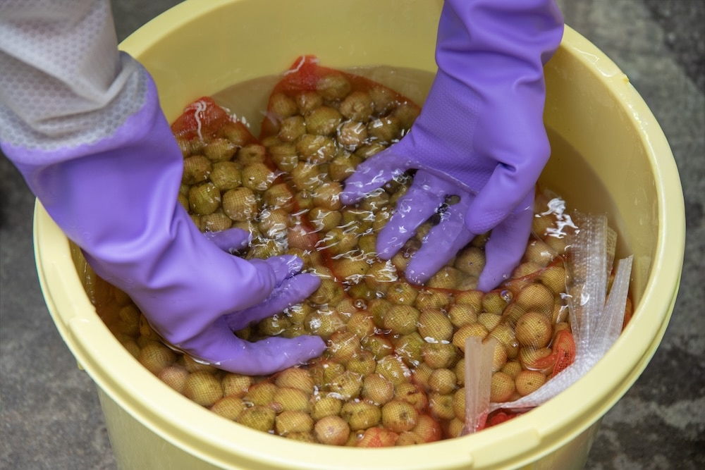 オリーブ果実の熟度を見極めて手摘みで収穫した、傷一つない、粒揃いのオリーブ果実。収穫後、再度入念に果実を選別したのち、その日の夜から翌朝にかけて渋抜きを行います。その後朝夕の水換えを数日かけて行い、塩水への漬け込みを開始。日々果実の状態を確認しながら、徐々に塩分濃度を上げていきます。漬け上がったら瓶詰めしたのち温熱殺菌を行い完成。漬け込みから漬け上がるまで約12日間にわたる、手間ひまをかけた作業です。