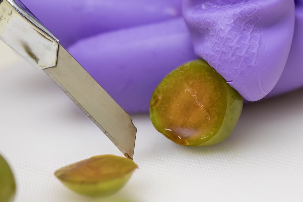 収穫のタイミングは、木にほんのり色づいた果実ーー皮が赤みを帯びたり、淡い紫色に変わった果実が数粒確認できる短いあいだが適期。今年は開花が遅れたこともあり、昨年よりも6日遅い9月24日に収穫を開始しました。今年は高温少雨とオリーブにとっては厳しい気象条件でしたが、夏場の水やりに注力したおかげで一粒一粒の実は大きく育っています。台風も少なく、傷実も少ないです。