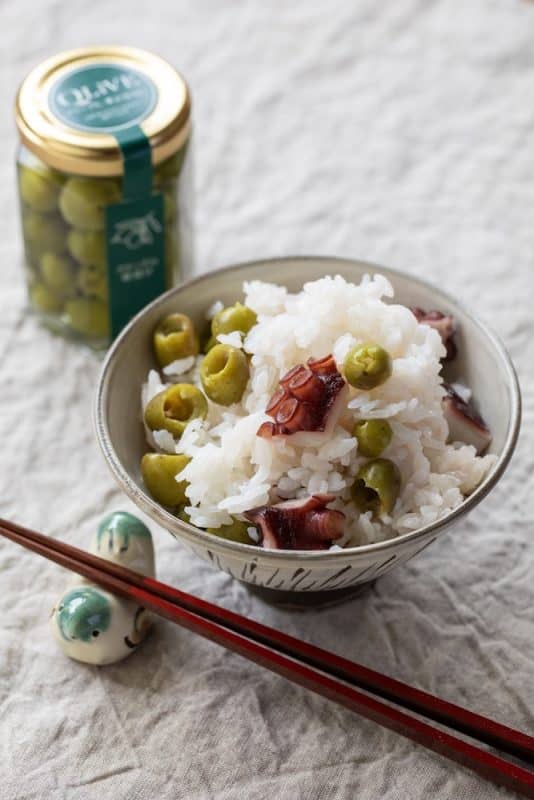 ふっくらとしたごはんと、タコのプリッとした食感と新漬けオリーブのこりっとした食感が絶妙に調和する