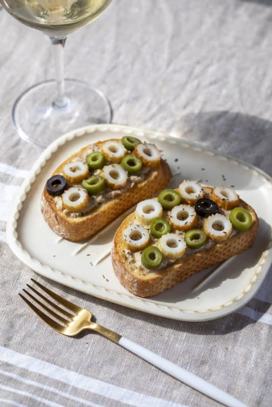②パンに①を塗り、輪切りにした新漬けオリーブとちくわを盛りつける。