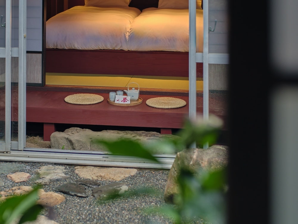 「Komado ベンガラ」は、小松市の中心部で町衆文化が今も息づく龍助町にあります。町家を改修してつくられた3つの客室では、この町の息遣いを感じられます。客室の窓の先に広がるのは、季節の移ろいを感じる中庭や、格子越しの通りの町の気配、瓦屋根の景色など、それぞれ異なる小松の日常風景。受け継がれてきた文化と新たな感性が静かに交わる空間で、ゆったりとした時間を過ごすことができます。