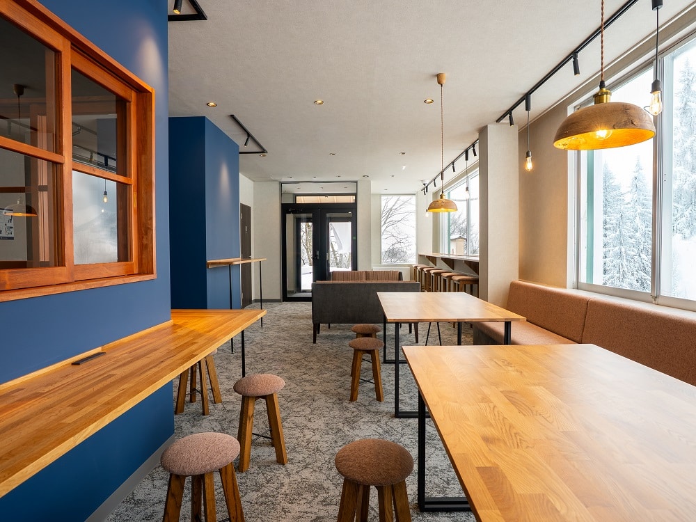 内装は「ホテル×ロッジ風(山小屋風)」をイメージ。雪山でのアクティビティを心ゆくまで楽しんだ後、温かく迎え入れてくれるような、木を基調とした落ち着いた空間デザインです。