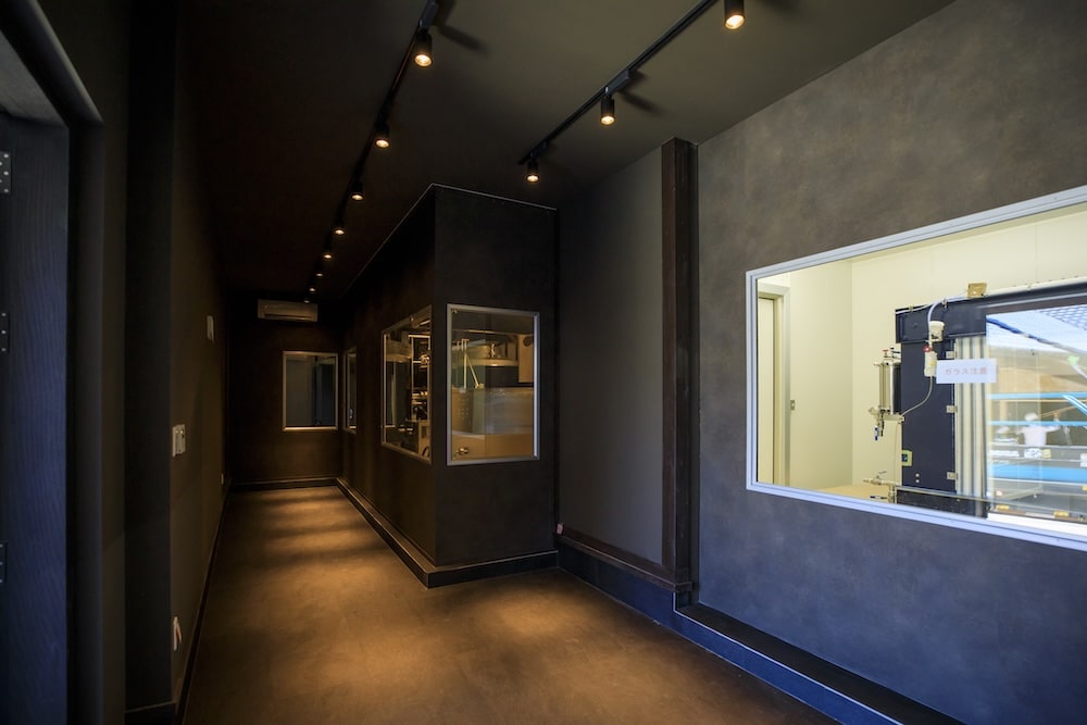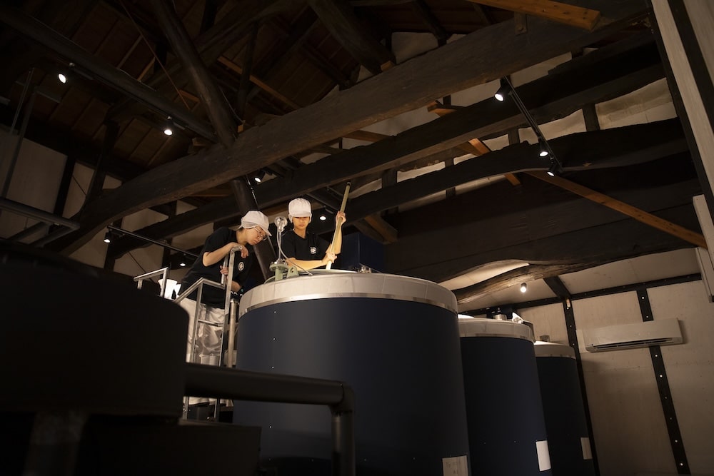 酒造りの様子を見学できるスペースを設けています。蒸米の様子や発酵タンク、圧搾機など、蔵人たちの熱心な作業の様子をガラス越しに間近で見ることができます。