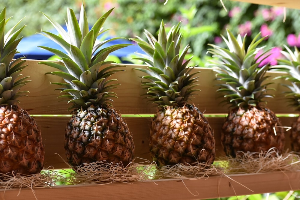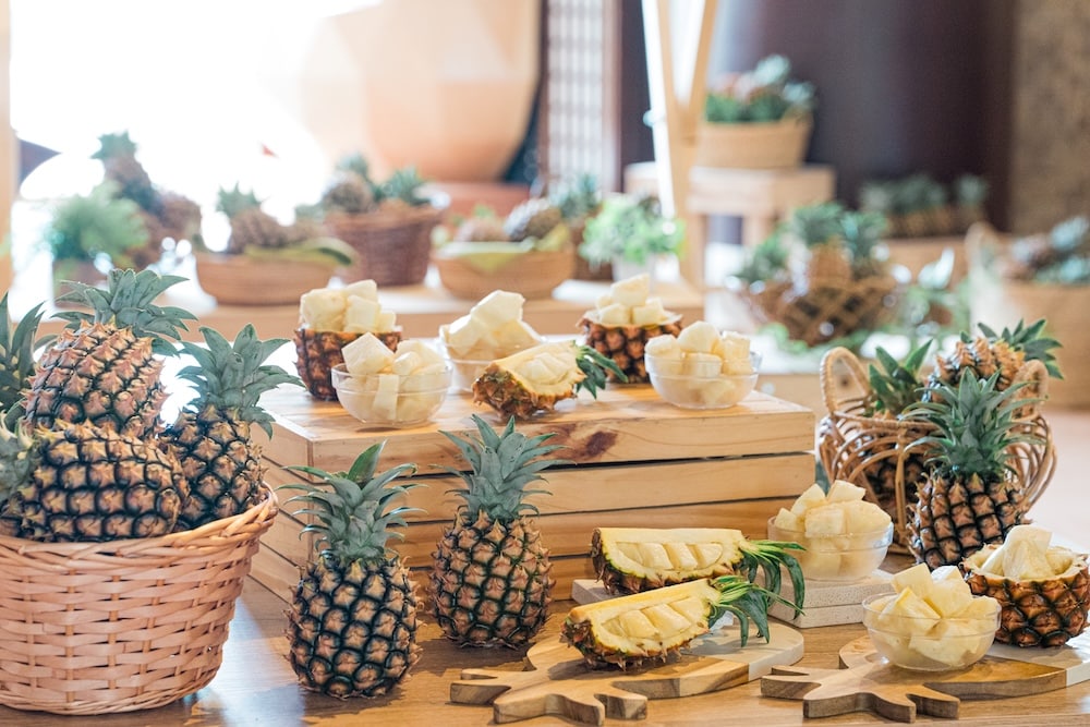 ピーチパインは、小ぶりな果実に果汁がたっぷりで、果肉は白っぽく、香りは桃のようなさわやかさが特徴です。また、パイン特有の繊維感も少なく、芯の部分まで食べられます。収穫後に追熟しないピーチパインを、完熟の一番美味しい状態で食べられるのは生産地だからこそです。本イベントでは、そんなピーチパインをカットし、ロビーにて提供。イベント期間中、みずみずしい食べごろのピーチパインを毎日楽しめます。